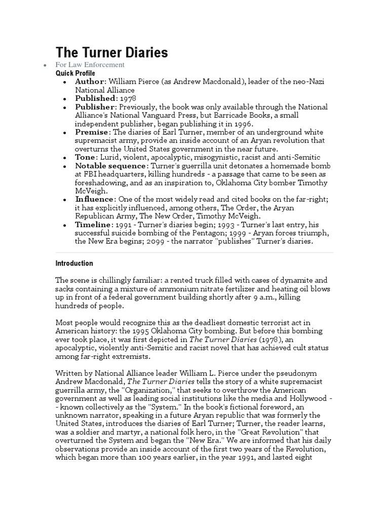 The Turner Diaries is probably the most widely read book among far-right extremists. The Bible of the Right Wing. This is an very simple means to.